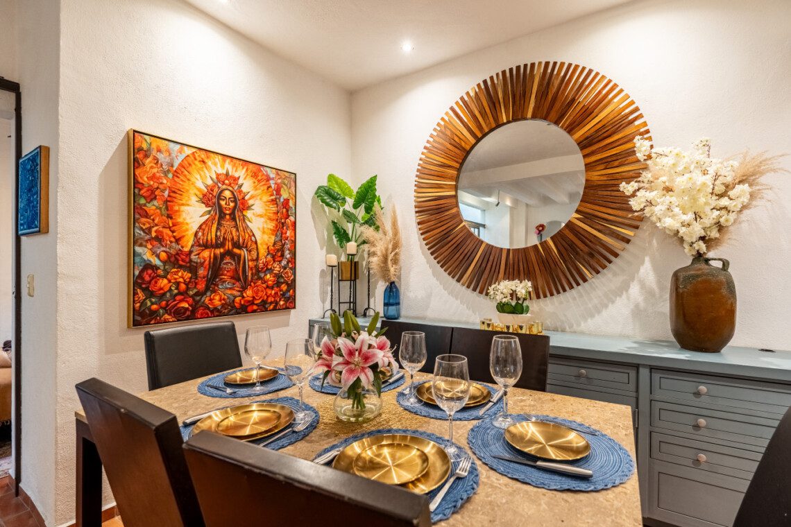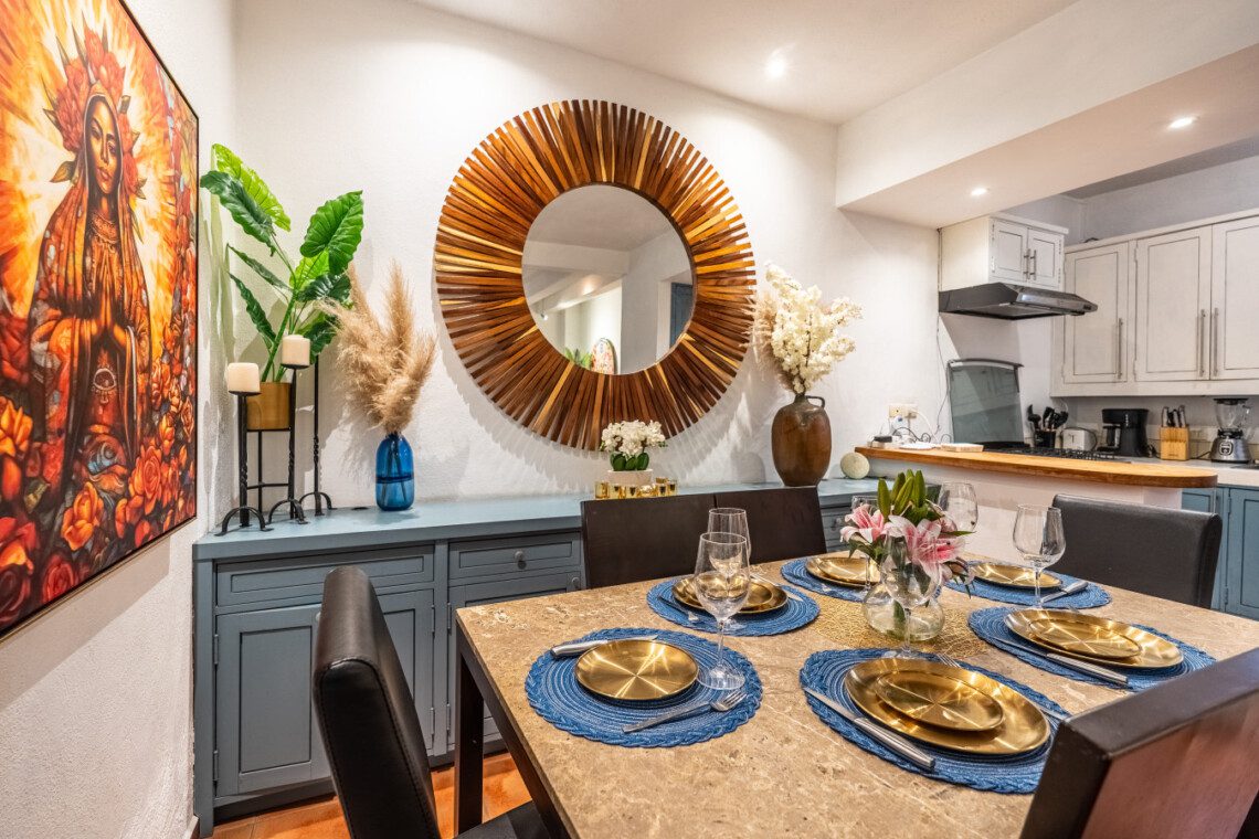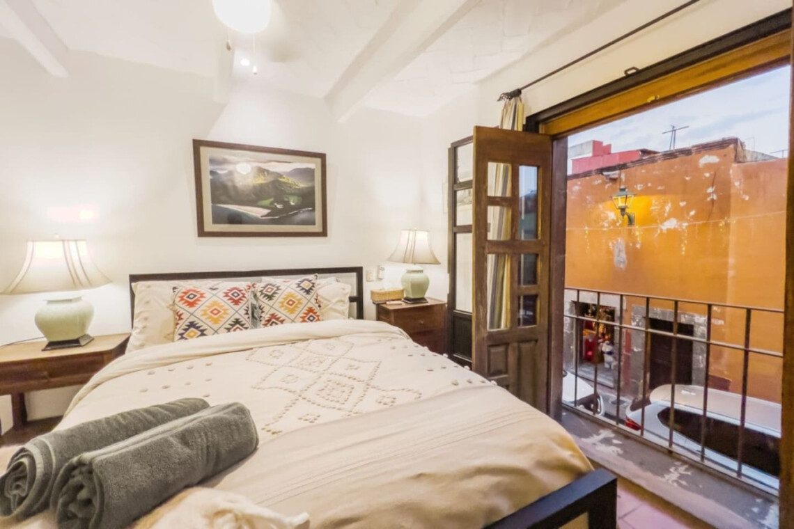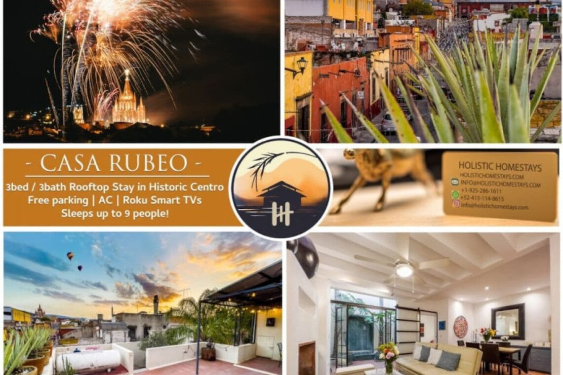 Casa Rubeo by Holistic Homestays LLC (IG@HolisticHomestays) -Centrally located in the historical downtown “Centro” of San Miguel de Allende. Historical building with modern interior and amazing downtown city views, fully equipped kitchen, two minisplit AC units upstairs, living rooms with high speed wifi, smart TV (with Netflix), gas fire place, electric heaters, patio fountain, terrace for sunbathing or sunset barbecue & drinks, free public parking on the street (if it’s not full), and easy street access with digital “keyless” lock. Comfortable, spacious, yet cozy with a great view.
