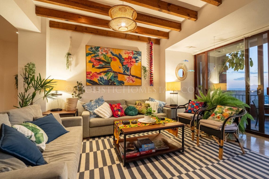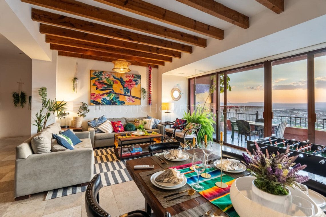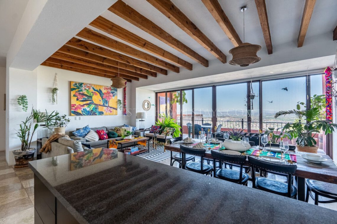 Step into the sky at EL NIDO (The Nest) — a uniquely designed luxury 3-bedroom, 3.5-bathroom vacation condo inspired by the vibrant elegance of a tropical bird paradise. Located within the prestigious gated community of Capilla de Piedra in historical downtown San Miguel de Allende, Mexico, 6 blocks from the famous Parroquia cathedral and El Jardin main square, this custom-themed retreat offers breathtaking style, comfort, and unparalleled sunset views from above the colonial city.